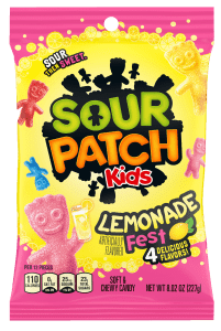 SOUR PATCH KIDS Lemonade Fest Soft & Chewy Candy delivers a summery, SOUR THEN SWEET blast to your tastebuds. Inspired by your favorite lemonade varieties, this sour candy comes in four delicious flavors: strawberry lemonade, blue raspberry lemonade, cherry lime lemonade and lemonade. Each bag of candy contains pink candy, blue candy, red candy and yellow candy in unique kid shapes that give these sour candies their name. SOUR PATCH KIDS and Lemonade pair so well in these sour gummy snacks because they both are sour and sweet, which makes them perfect for quick snacks or as holiday candy for Halloween, Valentine's Day or even a candy lover's birthday. SOUR PATCH KIDS soft candy also makes a great movie theater candy to snack on during your favorite flick. This bagged candy is the perfect size for stashing in purses, backpacks and lunchboxes.