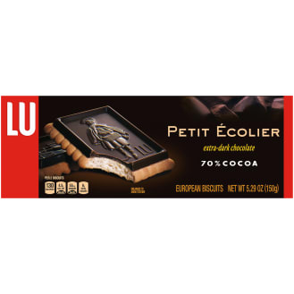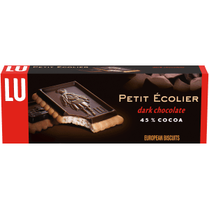 Lu Petit Ecolier European Dark Chocolate Biscuit Cookies feature glossy, European 45% cocoa dark chocolate paired with a French butter biscuit. With a Le Petite Ecolier, or 'The Little Schoolboy', design dating back to the 1880s and updated in the 1980s, these European cookies have classic appeal. Ideal for life's special occasions, serve these rich, luxurious dark chocolate cookies at your next upscale dinner gathering, set them out as a sweet treat during a tea party, or simply enjoy this chocolate dessert with a cup of coffee or tea as an afternoon snack.