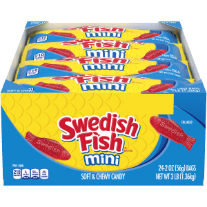 Shine a light on your next snacking session with SWEDISH FISH Mini Glow Ups Strawberry-Watermelon Soft & Chewy Candy. These fun, fish-shaped candy gummies feature edible confetti that glows under blacklight and a sweet strawberry-watermelon flavor that delights your taste buds with every chewy bite. The edible confetti in this unique candy contains turmeric extract, which gives it its fun glow (Hint: You cannot taste it). The first-ever gummy candy fish that glows, SWEDISH FISH Mini Glow Ups are a must-try for fans of bold, adventurous candy experiences. Serve this playful pink candy at your next blacklight party, pack it as a crowd-pleasing snack for a concert or music festival, or simply enjoy it as a fun, satisfying treat during movie nights and gaming marathons. Whether you’re solo snacking at home or sharing with friends, these glowing gummy candies light up any occasion. This bagged candy is a great pantry snack for tossing in your backpack so you can take these show-stopping gummy snacks on the go. Each bag of candy offers enough for a single event or to enjoy over time. Brighten your day with SWEDISH FISH Mini Glow Ups Strawberry-Watermelon Candy.
